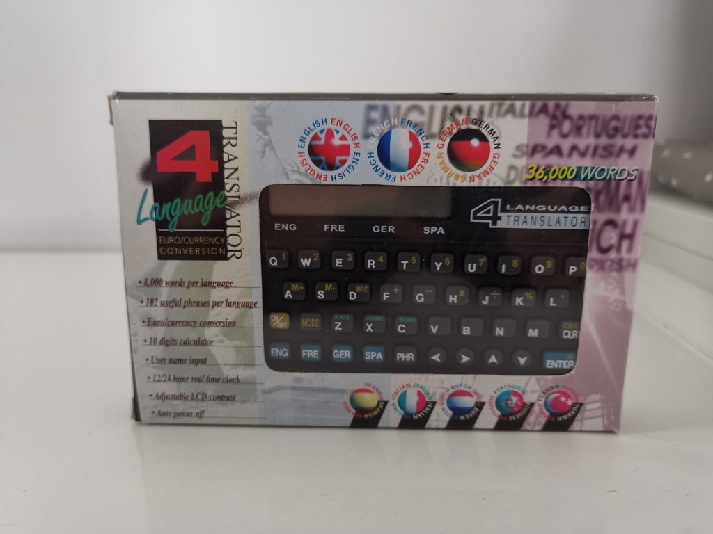 Toen ik het kantoor van mijn gepensioneerde vader opruimde, kwam ik dit pareltje tegen. De “4 Language Translator“ uit 1998. Met 8.000 woorden en 102 veelvoorkomende zinnen in drie talen plus één taal naar keuze. Dit leek mijn vader destijds vast een grote stap richting de volledig geautomatiseerde in-ear tolk van Captain Kirk. Men was alleen vergeten een Translator te laten kijken naar de handleiding van het apparaat. Dat stond namelijk vol met taalfouten.